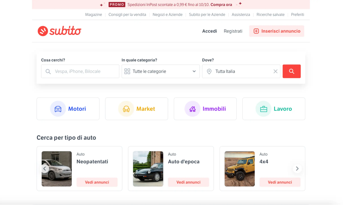 Subito(スビート)は、イタリア最大級のC2C(個人間売買)プラットフォームです。中古品から家具、車、不動産まで幅広いカテゴリの商品がやり取りされており、イタリア国内では日常的に利用されています。メルカリやジモティーに近い存在として、地域密着型の取引が多いのが特徴です。