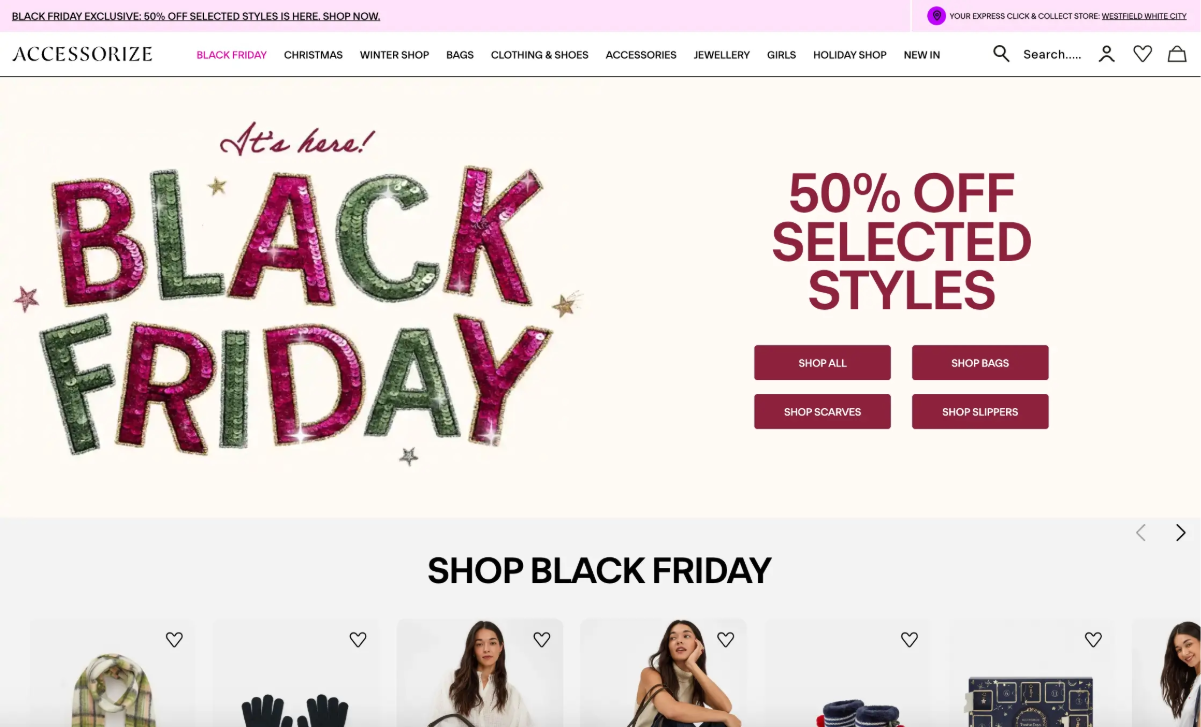 - 公式サイト(http://uk.accessorize.com/)は、基本的にイギリス国内向けに設計されており、日本への配送は未対応