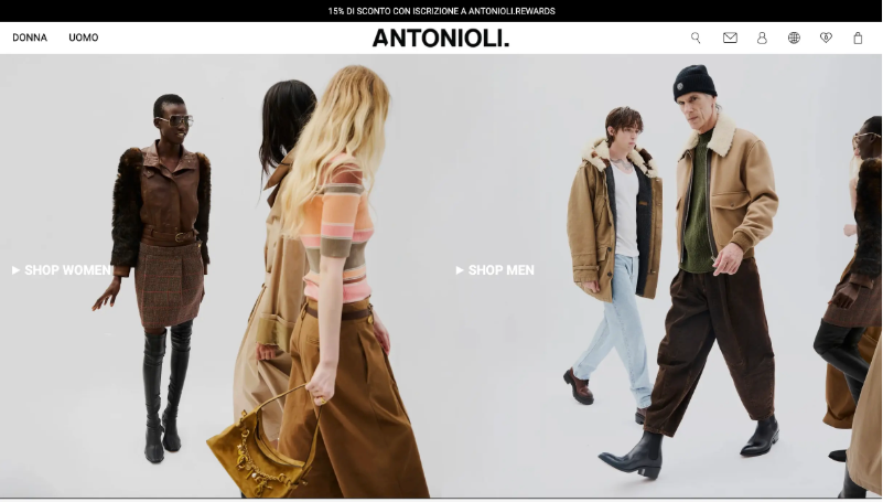 Antonioli(アントニオーリ)のオンラインサイトは、ミニマルかつ直感的な設計がなされており、海外通販初心者でも比較的スムーズに使える構成となっています。トップページでは新作コレクションや注目のブランドが大きくフィーチャーされており、まるでブティックを訪れたかのような視覚体験が可能です。